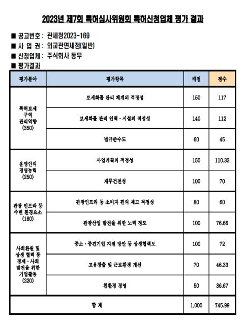 관세청은 '관세법 시행령'제192조의5 제6항에 따라 위원회에 참석한 위원 명단과 외교관면세점 신규 특허 평가 결과를 공개했다.