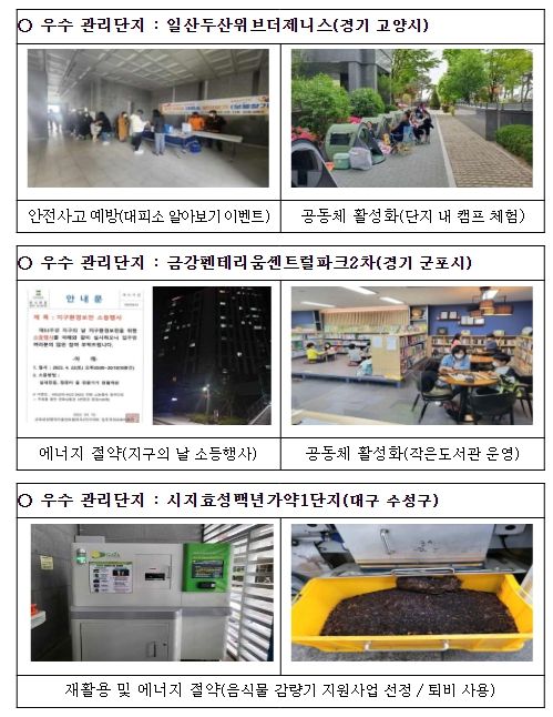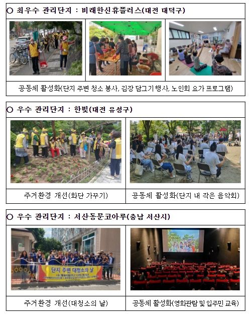최우수 단지로 선정된 대전 비래한신휴플러스의 경우 주민화합 행사 개최, 고령 친화 프로그램 운영 등을 통해 입주민들의 소통과 참여를 적극 유도하며 공동체 활성화 분야 우수사례를 적극 제시했고, 우수 단지들도 최우수 단지에 못지않게 주거환경 개선, 공동체 활동 지원, 안전사고 예방, 관리 투명화 등 다양한 분야에서 모범적인 사례를 제시하며 최선을 다하고 있었다.