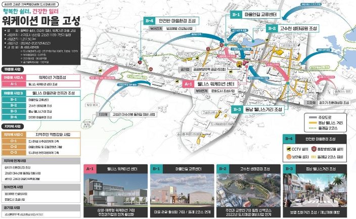 주요사업으로는 ‘상생-체류형 워케이션 마을 조성’이라는 특화전략을 추진하기 위해 위하여 ▲워케이션거점 조성(웰니스워케이션센터), ▲웰니스 마을관광인프라조성(마을안길교류센터, 고수천생태공원, 동남웰니스거리, 안전한마을환경만들기), ▲지역주민 역량강화사업(마을브랜딩 및 로컬콘텐츠개발, 도시재생사후관리체계 구축)이 추진될 계획이다.