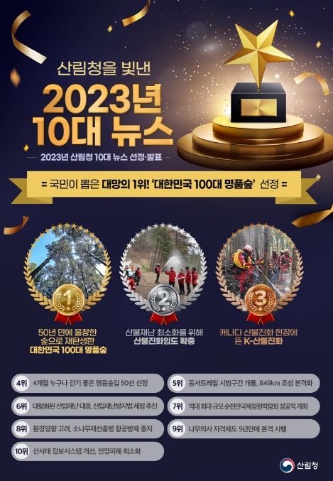 다음으로 관심을 끈 뉴스는 △2위 산불재난 최소화를 위해 산불진화임도 확충, △3위 캐나다 산불진화 현장에 뜬 K-산불진화, △4위 4계절 누구나 걷기 좋은 명품숲길 50선 선정, △5위 통서트레일 시범구간 개통으로 849㎞ 조성 본격화, △6위 대형화된 산림재난에 대응해 산림재난방지법 제정 추진, △7위 역대 최대 규모 순천만국제정원박람회 성공적 개최, △8위 환경영향을 고려한 소나무재선충병 항공방제 중지, △9위 나무의사 제도 5년 만에 본격 시행, △10위 산사태 정보시스템 개선으로 인명피해 최소화 등이 선정됐다.
