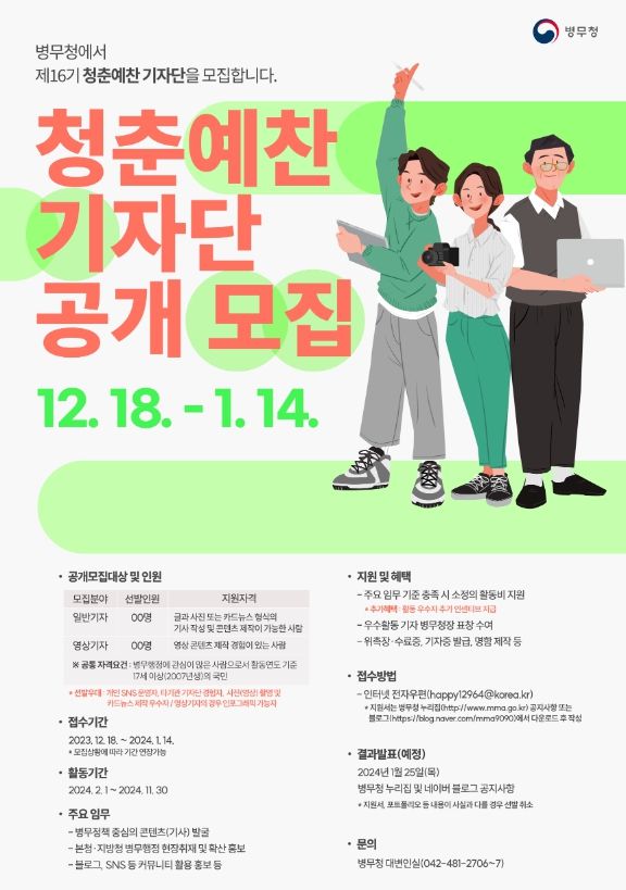 [제주교통복지신문 박상현 기자] 병무청은 2024년에 활동할 ‘제16기 청춘예찬 기자단’을 공개 모집한다.