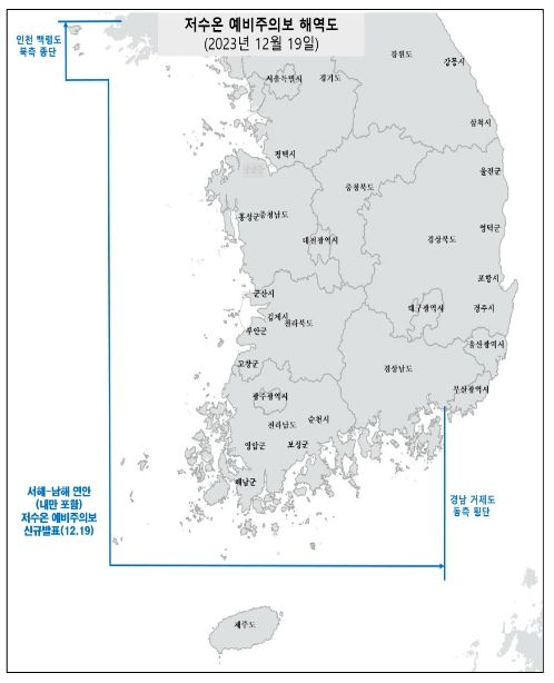 찬 대륙고기압의 영향으로 기온이 큰 폭으로 떨어지고 이번 주까지 한파의 영향을 받을 것으로 전망됨에 따라, 국립수산과학원은 수온 하강이 예상되는 서해와 남해 연안(내만 포함)에 저수온 예비주의보를 발표(12. 19. 14시)했다.
