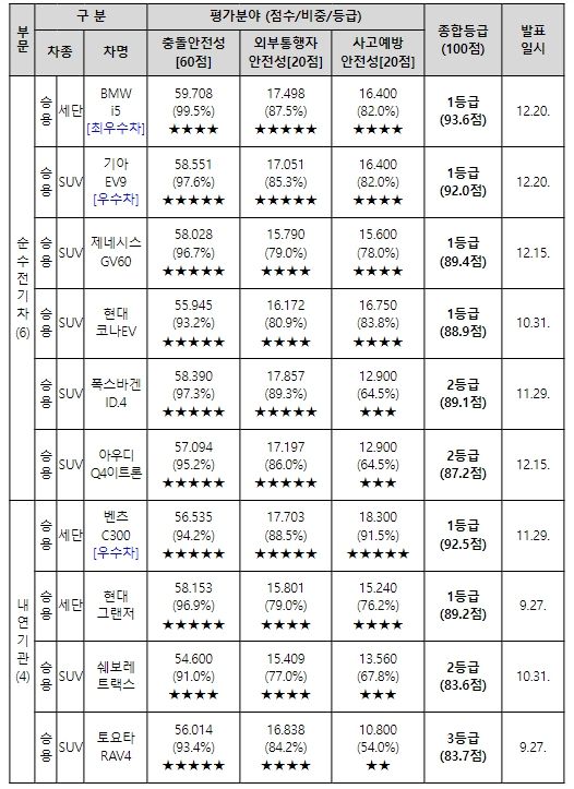 10개 평가 차종 중 BMW i5, 벤츠 C300, 기아 EV9, 제네시스 GV60, 현대 코나EV, 현대 그랜저 등 6개 차종이 3개 평가 분야에서 높은 점수를 얻어 1등급을 획득했다.