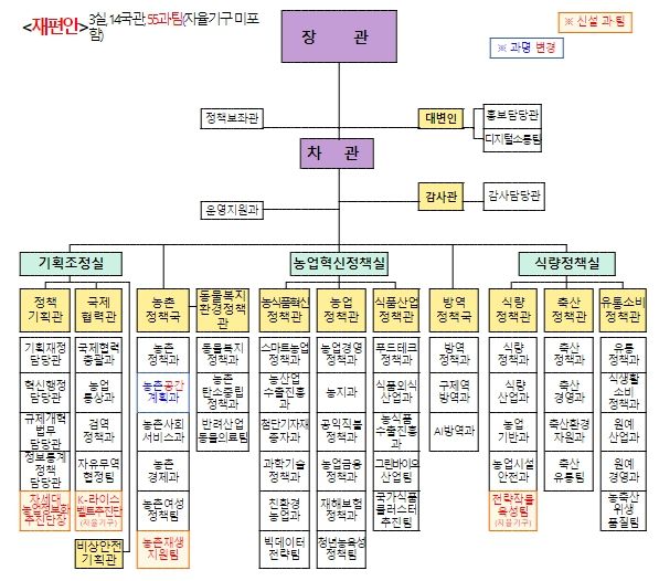 이번 조직 재편으로 농식품부는 기존 3실, 14국·관, 53과․팀에 2개 과․팀을 더해 55과․팀 체계로 변화하게 되며, 세부 내용은 다음과 같다.