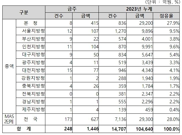 지역별 발주량을 보면, 총액계약 대상 819억 원 중 본청이 415억 원으로 50.7%를 집행하고 서울청 등 11개 지방청에서 404억 원을 각각 집행할 예정이다.