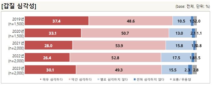 갑질 심각성에 대해서는 응답자의 79.4%가 ‘우리 사회의 갑질이 심각하다’고 생각하고 있으나, 전년과 비슷한 수준으로 과거에 비해 완만한 감소추세를 보이고 있다.