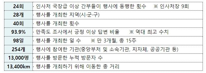 올해 최초로 전국 각지를 순회하며 ‘찾아가는 방식’으로 진행된 공직박람회는 지난 9월 14일부터 12월 21일까지 전국 28개 시‧군‧구에서 대학교 19회, 고등학교 14회, 다른 기관과 연계한 취업 행사 7회 등 총 40회 개최됐다.
