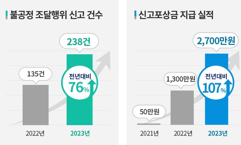 2023년 불공정조달 신고센터는 238건의 신고를 접수, 이는 전년도 (135건) 대비 76% 증가한 수치로 역대 최고 신고 건수를 기록한 것으로 집계됐다.