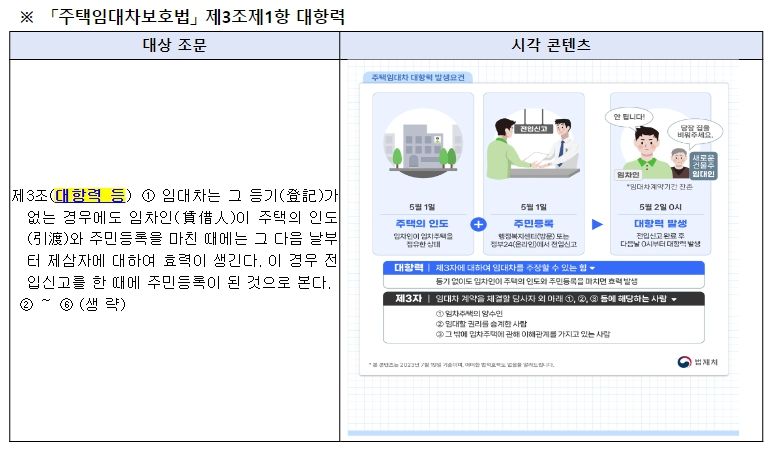 그 예시로 '주택임대차보호법' 제3조제1항에 따른 대항력 등의 경우 어려운 한자어 등이 포함된 내용을 이해하기 쉽게 그림으로 표현했다.