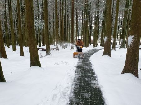 [제주교통복지신문 김현석 기자] 제주시 절물자연휴양림에서는 겨울철 탐방객을 안전하게 맞이하기 위해 진입로와 주차장 등에 제설작업을 실시했다.