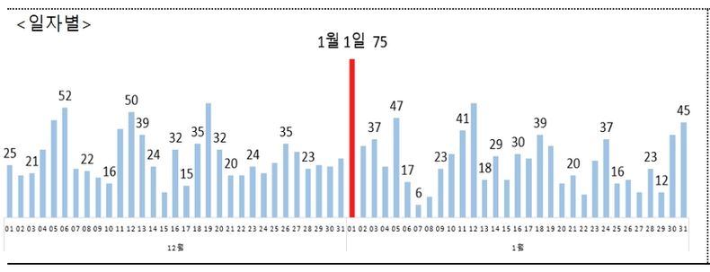 최근 2년(2020 ~2021년) 동안 발생한 등산사고는 총 14,950건으로 8,698명(사망 192명, 부상 8,506)의 인명피해가 발생했는데, 이 중 연말연시(12월, 1월)에 발생한 등산사고는 1,758건이며, 해맞이 산행을 하는 1월 1일에는 연말연시 기간 중 하루에 75건으로 가장 많이 발생했다.