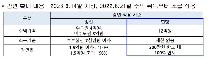제도 시행(’22.6.21.) 이전에는 주택가액이 수도권의 경우 4억 원 이상, 비수도권의 경우 3억 원 이상이거나, 부부합산 소득 7천만 원 이상인 경우 감면 제한 기준이 적용되어 감면대상이 아니었다.