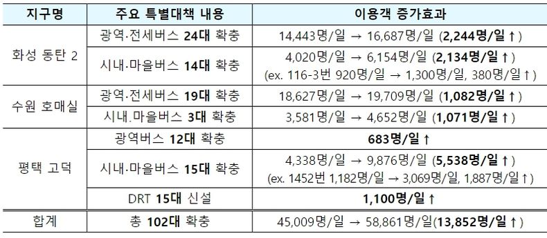 ① 특별대책 지구로 지정된 화성 동탄 2, 수원 호매실, 평택 고덕지구의 경우, 화성 동탄 2는 광역․전세버스 24대 확충으로 이용객 2,244명/일 증가, 시내․마을버스 14대 확충으로 이용객 2,134명/일 증가했다.