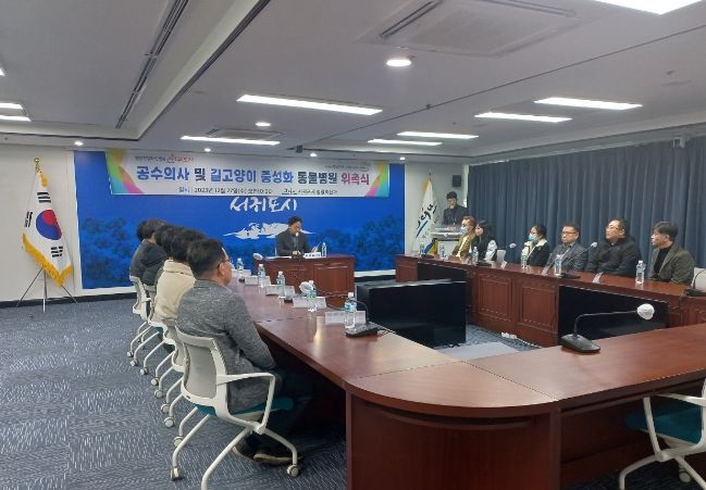 [제주교통복지신문 김현석 기자] 서귀포시는 2024년에도 가축전염병 차단방역 시스템 구축과 축산농가별 맞춤형 방역서비스 제공을 위한 공수의사 및 사람과 동물이 공존하는 도시 조성을 위한 길고양이 중성화 지정 동물병원을 선정해 12월 27일 위촉장을 전달했다.