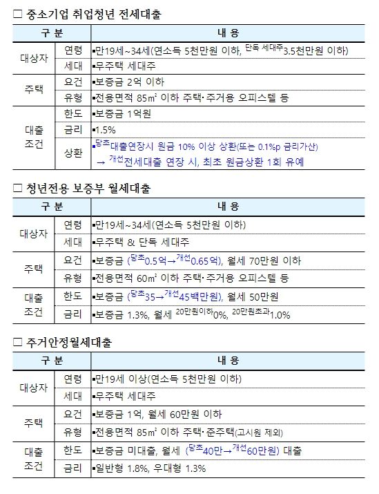 「청년 등 국민 주거안정 강화방안(’23.11.24)」 등에 따라, 청년의 주거비 부담을 완화하기 위해 전월세 대출지원도 강화한다.