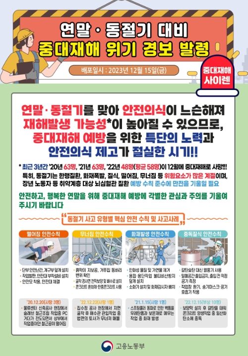 연말에는 공사기간에 맞춰 급하게 작업을 마무리하거나 연말연시 들뜬 분위기로 인해 안전의식이 느슨해지는 경우가 많아 중대재해가 발생할 우려가 크다. 실제 성탄절 연휴 전날인 지난 12월 22일에는 하루 동안 총 8명의 중대재해가 발생한 바 있다. 이에 고용노동부는 새해 첫날 연휴 전까지 각별한 주의가 요구된다며, 12월 15일에 발령했던'연말·동절기 대비 중대재해 위기 경보'를 중대재해 사이렌을 통해 재차 발령하고, 사업장에도 안내문을 배포할 예정이다.