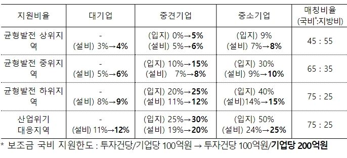 먼저, 기존 보조금 지원한도(기업당 국비 100억원)로 인해 대규모 투자 및 지속적 투자유인이 부족하다는 산업현장의 요구를 반영하여 기업당 지원한도를 2배(200억원)로 상향하고, 설비투자 보조금 지원비율을 1%p씩 높이기로 했다.(중견기업의 경우 입지투자 보조금 지원비율 5%p 추가상향)
