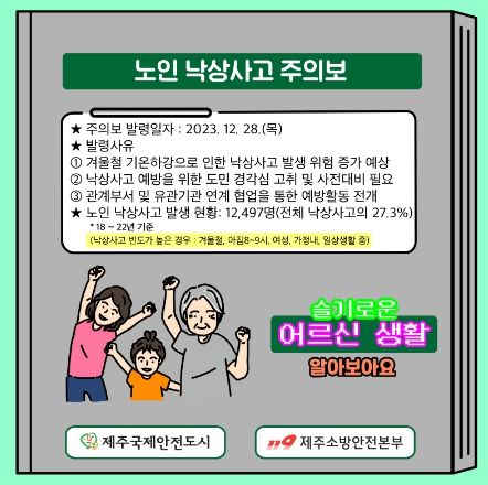 [제주교통복지신문 김현석 기자] 제주특별자치도 소방안전본부는 본격적인 겨울철을맞아 환경적 신체적 요인 등으로 인한 낙상사고 인명피해 방지를 위해 오는 28일 겨울철 노인 낙상사고 주의보를 조기에 발령하고 빈틈없는 안전관리에 나선다.
