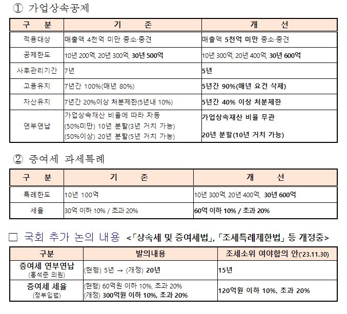 올해초부터 가업승계 대상 확대(4→5천억원), 상속공제 한도 상향(500→600억원), 증여세특례 한도 증액(100→600억원), 증여세 저율 과세 확대(30억 이하 10%→60억 이하 10%) 등 상속세 및 증여세 과세특례가 대폭 개선되어 가업승계시 과세 부담을 줄였고, 여기에 더해서 증여세 저율과세 10% 구간 추가상향(60→120억원), 연부연납(증여세 분할납부) 기간확대(5→15년) 등을 담은 세법 개정안이 국회에서 심의중에 있다.