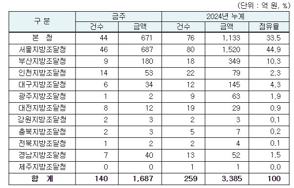 지역별 발주량을 보면 대전광역시 소재 본청 671억 원, 서울지방청 687억 원 등 2개청(1,358억 원)이 전체 금액(1,687억 원)의 80.5%를 차지하고 있으며, 인천 등 나머지 10개 지방청 329억 원이 각각 집행될 예정이다.