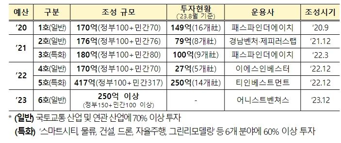 제6호 자펀드를 끌어나갈 운용사는 1차(서류심사 및 현장실사), 2차(발표평가, 출자심의회) 평가를 거쳐 ‘어니스트벤쳐스’가 선정(‘23.6)됐으며, 국토교통 유망분야의 혁신을 선도할 수 있는 혁신성·기술성을 갖춘 중소·벤처기업들을 발굴하여 집중 투자할 계획이다.