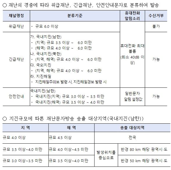 현재는 지역에서 지진 규모 3.0 이상이 발생하면 관련 규정에 근거하여 재난의 경중에 따라 위급재난, 긴급재난, 안전안내문자로 구분하고, 지진의 발생 위치를 중심으로 해당 광역시·도 단위로 지진 재난문자를 송출하게 되어 있다.