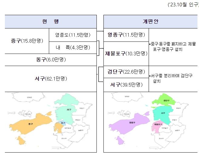 법률안은 ▲ 중구 내륙 지역과 동구를 관할하는 제물포구 설치 ▲ 중구 영종도 지역을 관할하는 영종구 설치 ▲ 서구 아라뱃길 북쪽을 관할하는 검단구 설치 등을 담고 있다.