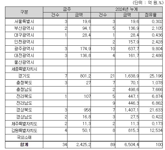 지역별로는 경상북도 958억 원, 경기도 801억 원, 광주광역시 175억 원, 그 밖의 지역이 491억 원이다.