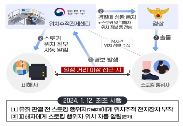 스토킹 가해자가 접근 시 피해자에게 가해자의 접근사실이 자동으로 문자전송 되고, 경찰이 신속히 출동하는 등 피해자 보호조치도 한층 강화될 예정이다.