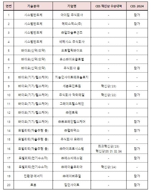 이 중 시스템반도체 분야의 메티스엑스㈜ 등 11개사는 미국 라스베가스에서 개최된 ‘국제전자제품박람회(CES) 2024’에 참가했으며, 특히, ㈜마이크로시스템 및 ㈜에이올코리아는 국제전자제품박람회(CES) 2024 최고 영예인 혁신상(Innovation Awards)을 수상했다.