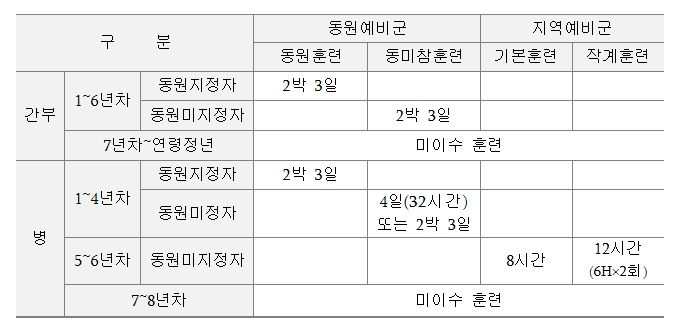 동원훈련(숙영훈련)은 동원지정된 1~4년차 예비군들을 대상으로 현역부대 및 동원훈련장에서 2박 3일간 실시한다.