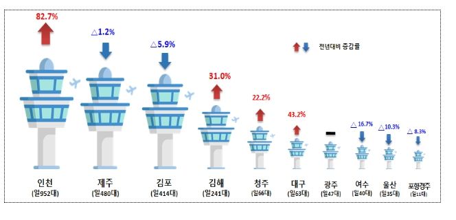 또한, 코로나-19 종식에 따른 펜트업 효과*로 인천공항(82.7%↑)뿐만 아니라 청주·김해·대구 등 지방 국제공항의 항공교통량이 각각 31%, 22%, 43%로 고르게 크게 증가했다.