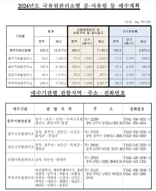 관련내용은 산림청 누리집 ‘사유림을 삽니다’란의 ‘중부지방산림청 2024년 공·사유림 매수계획 공고’에서 확인할 수 있으며, 자세한 문의는 중부지방산림청 해당지역 관할 국유림관리소로 문의하면 된다.