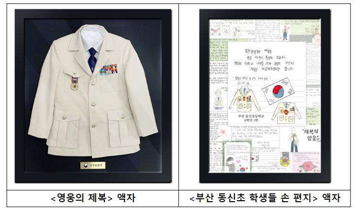 ‘영웅의 제복’ 액자는 6·25참전용사들에게 지급된 베이지색 상의와 남색 넥타이로 구성된 제복을 액자(가로 90cm, 세로 100cm)에 넣은 것으로, 강정애 장관은 이날 ‘영웅의 제복’ 액자와 함께 부산 동신초등학교 학생들이 “6·25 참전용사들을 위한 명예 제복을 무상으로 지급해달라”며 지난 2022년 7월 국가보훈부 장관에게 썼던 손 편지를 담은 액자도 함께 헌정할 예정이다.