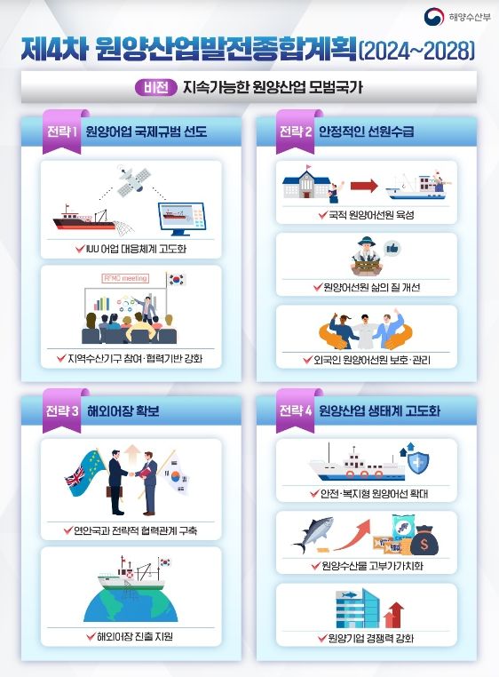 [제주교통복지신문 송한신 기자] 해양수산부는 우리 원양산업의 경쟁력 강화와 지속가능한 발전을 위한 「제4차 원양산업발전종합계획」을 수립하여 24일 발표했다.