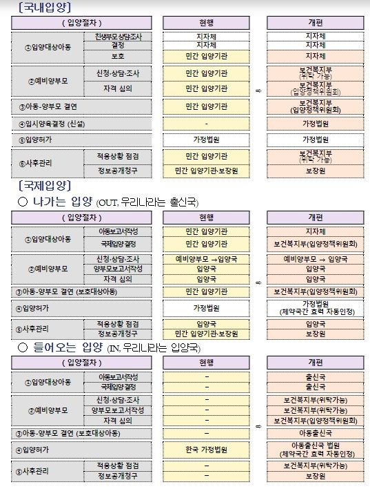 이는 지난해 7월 18일 '국내입양에 관한 특별법'과 '국제입양에 관한 법률'이 제·개정됨에 따라, 내년 7월 19일 시행을 준비하기 위한 것이다. 법이 시행되면 현재 입양기관에서 수행 중인 입양업무 전반에 대해 국가와 지방자치단체의 책임이 강화된다. 입양대상아동의 결정 및 보호는 지방자치단체에서 수행하며, 예비양부모 자격심사와 결연 등 핵심 절차는 보건복지부 입양정책위원회(위원장: 보건복지부장관)에서 ‘아동 최선의 이익’에 따라 심의하고 결정하게 된다.