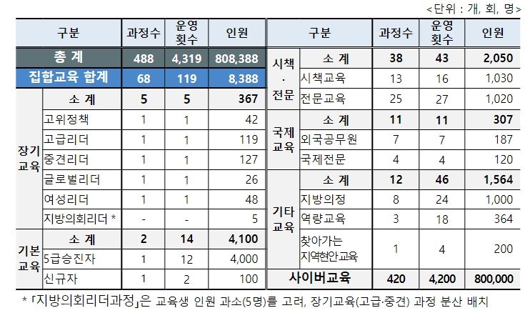 1월 8일 5급승진리더과정 교육(430명)을 시작으로 지방공무원은 물론, 지방의원, 지방공기업 임직원, 더 나아가 몽골, 이집트, 스리랑카 등 외국공무원을 대상으로 68개 과정 8,300여 명(사이버교육 포함 시 488개 과정 80만여 명)에게 최고 수준의 교육서비스를 제공할 계획이다.