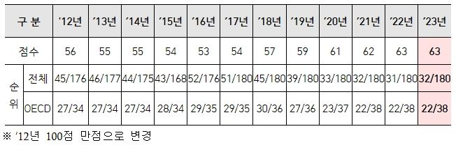 이번 우리나라의 점수는 지난해와 같고 순위는 카보베르데(35위→30위)가 우리나라보다 선순위로 올라 한 단계 하락했다. OCED 국가 중에서는 지난해와 동일한 22위를 유지했다.