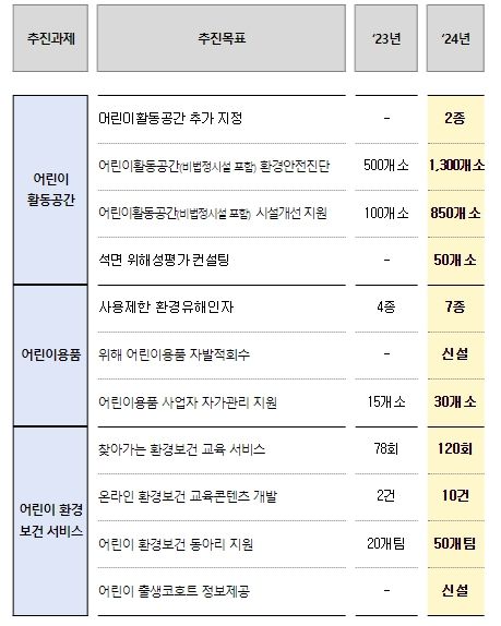 어린이가 자주 활동하는 시설의 환경을 안전하게 관리하기 위해 어린이활동공간 소관부처(교육부, 보건복지부 등)와 합동조사 및 개선대책을 마련하고, 어린이활동공간의 환경안전 진단과 시설개선 지원을 확대(진단 : 500개소(‘23)→1,300개소(’24), 개선 : 100개소(‘23) → 850개소(’24))할 예정이다. 또한, 관리 대상 어린이활동공간을 추가 검토하고 어린이 석면건축물 안전관리도 강화한다.