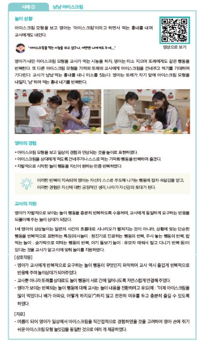 해당 자료집은 교사들이 다양한 놀이 상황에 맞게 적용할 수 있도록 약 50가지 사례를 제시하고, 특히 놀이 과정은 사례마다 정보무늬(QR코드)로 연결되어 영상자료로 어린이집 교사들이 현장에서 손쉽게 따라 하고 응용할 수 있도록 구성되어있다.