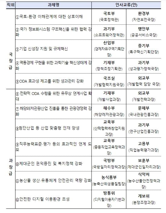 특히 협업이 필요한 공통업무가 소관 업무에서 차지하는 비중 등을 고려해 국장급(10개)과 과장급(14개)을 적절히 안배해 교류 실효성을 높일 수 있도록 했다.