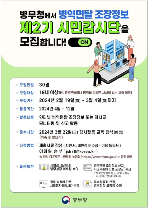 모집 기간은 2월 19일부터 3월 4일까지이며, 모집인원은 30명으로 병역면탈 예방활동에 관심이 있는 19세 이상이면 누구나 지원 가능하다. 지원 방법은 병무청 누리집(공지사항)에 게시된 지원서 등을 작성하여 전자우편으로 제출하면 된다.
