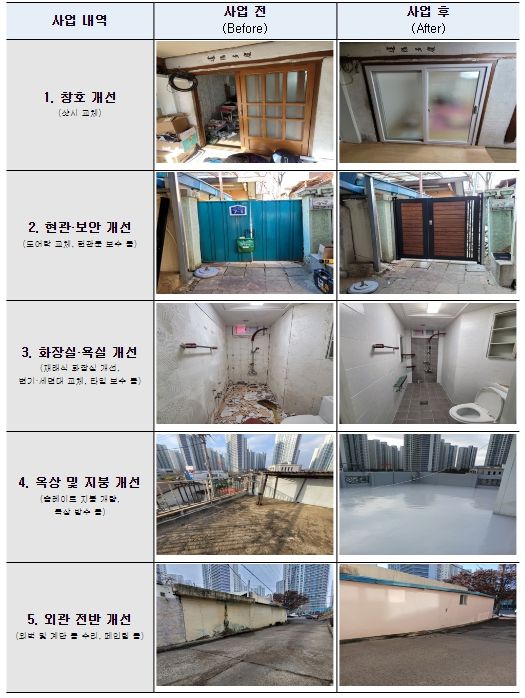 이 마을에서 지난 한 해 동안 창호 교체, 현관문 보수, 도어락 교체, 내벽 및 바닥 보수, 옥상개선, 외벽 개선 등 집수리가 성공적으로 완료됐고, 열악한 환경이 안락한 보금자리로 바뀌어 주민들의 만족도가 매우 높았다.