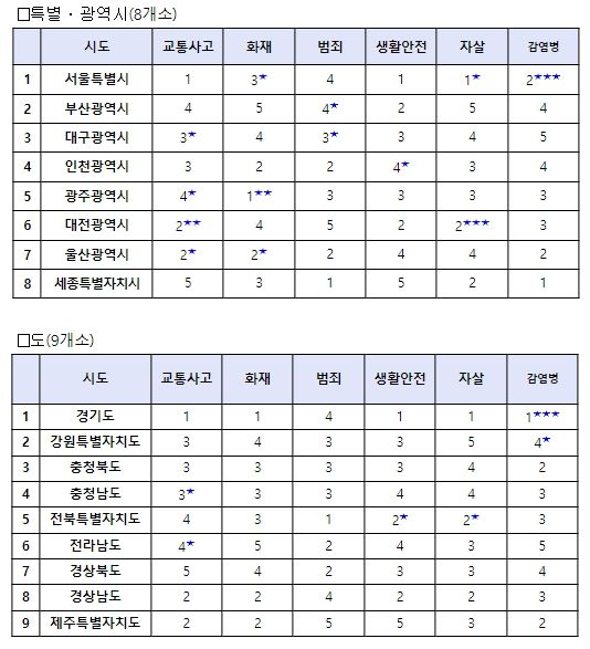 군․구 지역은 대구 달성·경북 칠곡(교통사고·화재·생활안전), 전북 진안(화재·범죄·자살), 서울 서초(교통사고·자살·감염병), 광주 남구(화재·범죄·생활안전), 울산 동구(교통·범죄·감염병)가 3개 분야에서 1등급을 달성했다.