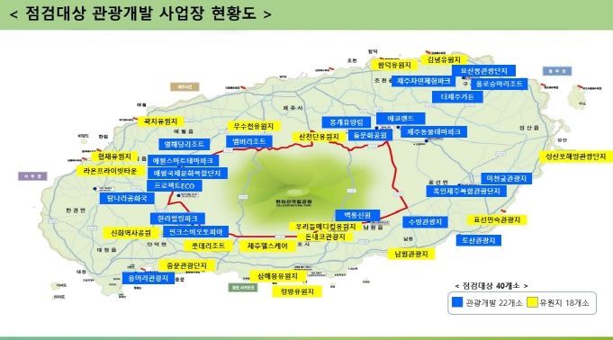점검 대상 사업장은 총 40개소로 관광개발사업 22개소, 유원지 18개소가 해당된다. 이 중 준공(완료)된 사업장은 3개소, 일부 준공돼 운영 중이거나 공사 중인 사업장은 35개소, 미착공 사업장 2개소다.