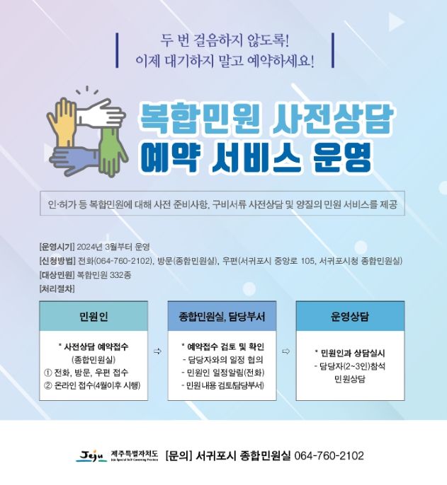 [제주교통복지신문 김현석 기자] 서귀포시에서는 관련 부서가 다수이고 다양한 법률의 적용을 받거나 전문성이 요구되는 복합민원에 대해 사전상담 예약 서비스를 오는 4일부터 운영한다.