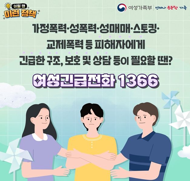 여성폭력피해자 지원시설인 여성긴급전화1366제주센터는 여성폭력(가정폭력, 스토킹 등) 피해자에게 긴급구조, 보호 및 상담 등의 서비스를 365일 24시간 지원하고 있다.