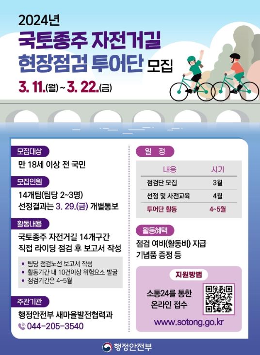 [제주교통복지신문 박상현 기자] 행정안전부는 2024년 상반기 국토종주 자전거길 현장점검 투어단을 3월 11일부터 3월 22일까지 모집한다고 밝혔다.