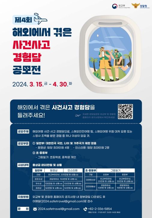 [제주교통복지신문 박상현 기자] 외교부와 경찰청은 공동으로 국민의 안전한 해외여행을 위한 정부 지원제도 및 영사조력법을 홍보하고, 해외 사건사고 예방 및 위기 상황 대처법 소개를 위해, 정부의 ‘제4회 해외에서 겪은 사건사고 경험담 공모’를 3월15일부터 4월30일까지, 46일 동안 진행한다.