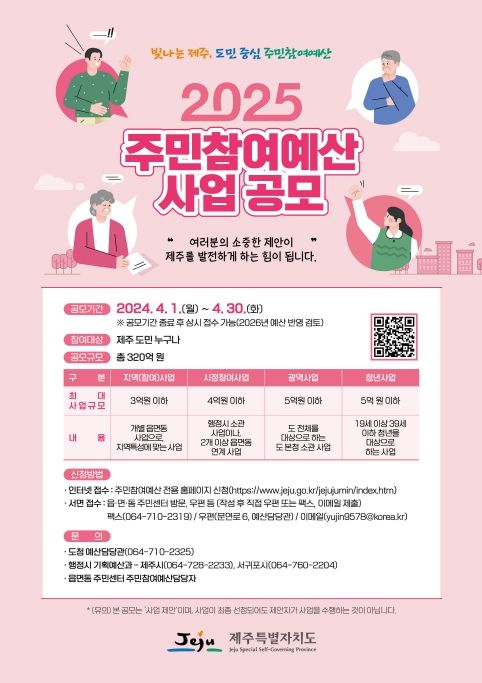 [제주교통복지신문 김현석 기자] 제주특별자치도는 2025년도 예산편성에 반영할 주민참여예산 사업을 4월 30일까지 집중 공모한다.